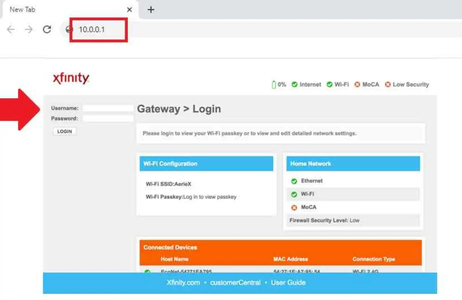 Default Login IP Address for Xfinity Gateway or Cable Modem– 10.0.0.1
