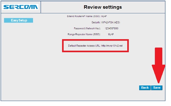 Press the Save button to confirm configuration or press the back button to change any settings on extended network name or password confirmation.