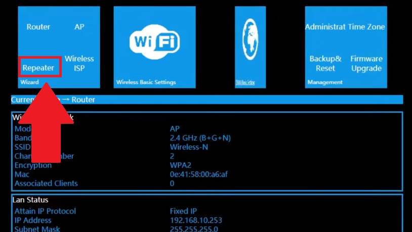 - You will get an extender dashboard where you can find all wireless modes, LAN settings, and other device information and status.