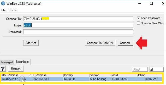 Click on Mac address showing in Neighbors list and press connect. No password configured for the new Mikrotik device. Showing router broad RB3011UiAS Cloud core router with uptime.
