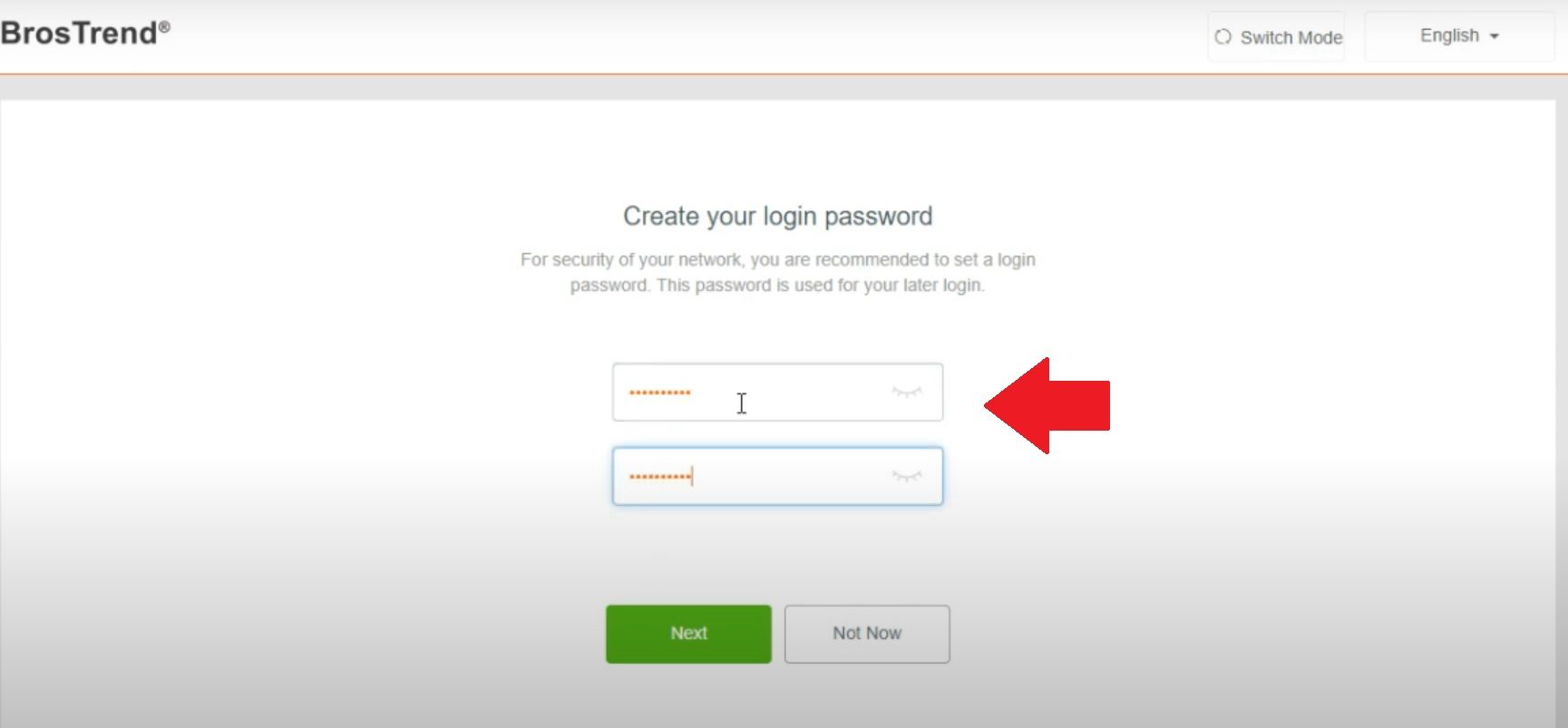 - First-time login you need to create a Brostrend admin login password to secure access. Create a login password and press the next button to start the setup wizard.