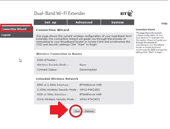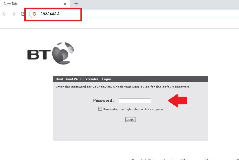 You need to connect a wireless or wired connection with a BT extender to perform configuration using the web login method. You need a default login IP address and password for the first-time setup BT booster device.