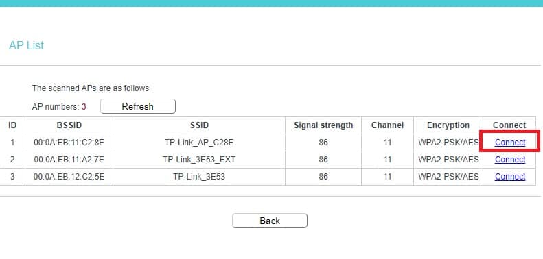 Find your main WiFi name from the list and press connect button to join the network from the range extender device to extend the same network.