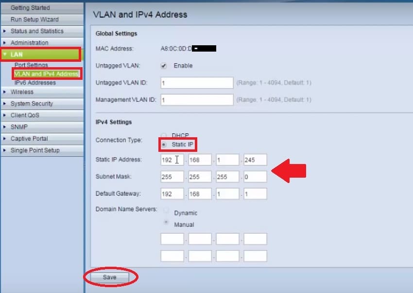 Connection Type: By default, the Connection type is DHCP so change it to Static mode.