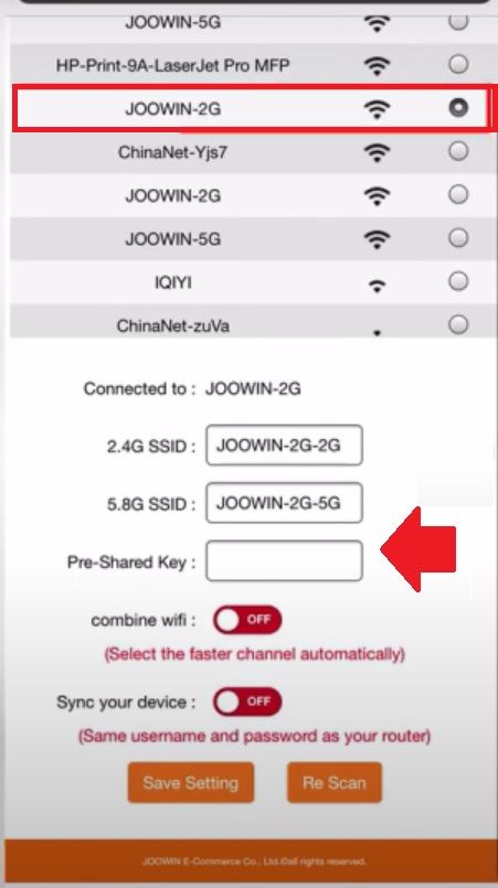 Pre Shared Key- type Old WiFI security key to allow connection from Joowin. (extender wifi password will be same as old WiFi password)