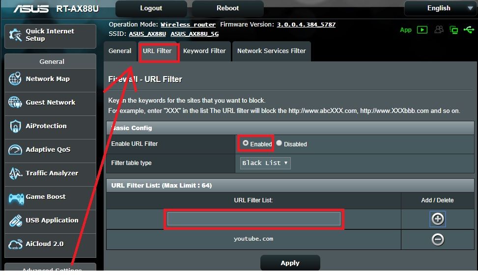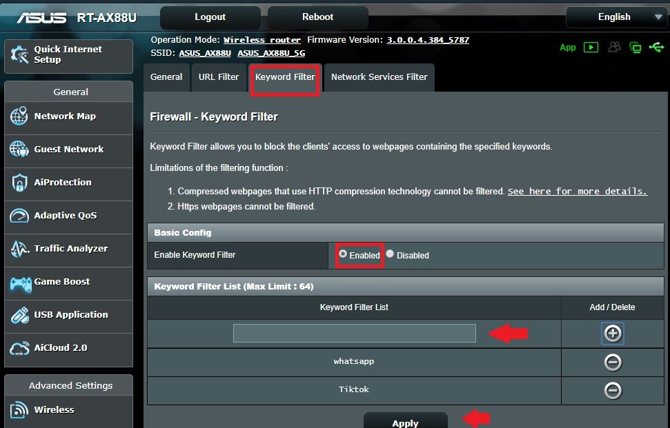 Keyword filter list- add keyword name to block on your internet. Like, use Whatsapp to block the WhatsApp app and add TikTok to block TikTok in the Asus WiFi router.