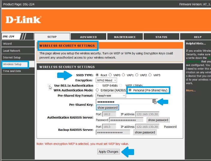 SSID Type- Root (if using multiple wifi name use VAP0, VAP1 one by one to setup password)