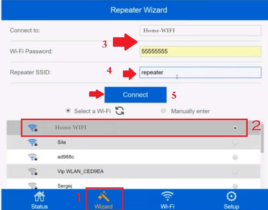 - Press the Connect button and wait to save settings in the next steps. The repeater will take 1-2 minutes to save settings and connect the repeater to your old WIFI network so keep calm and let the process finish.