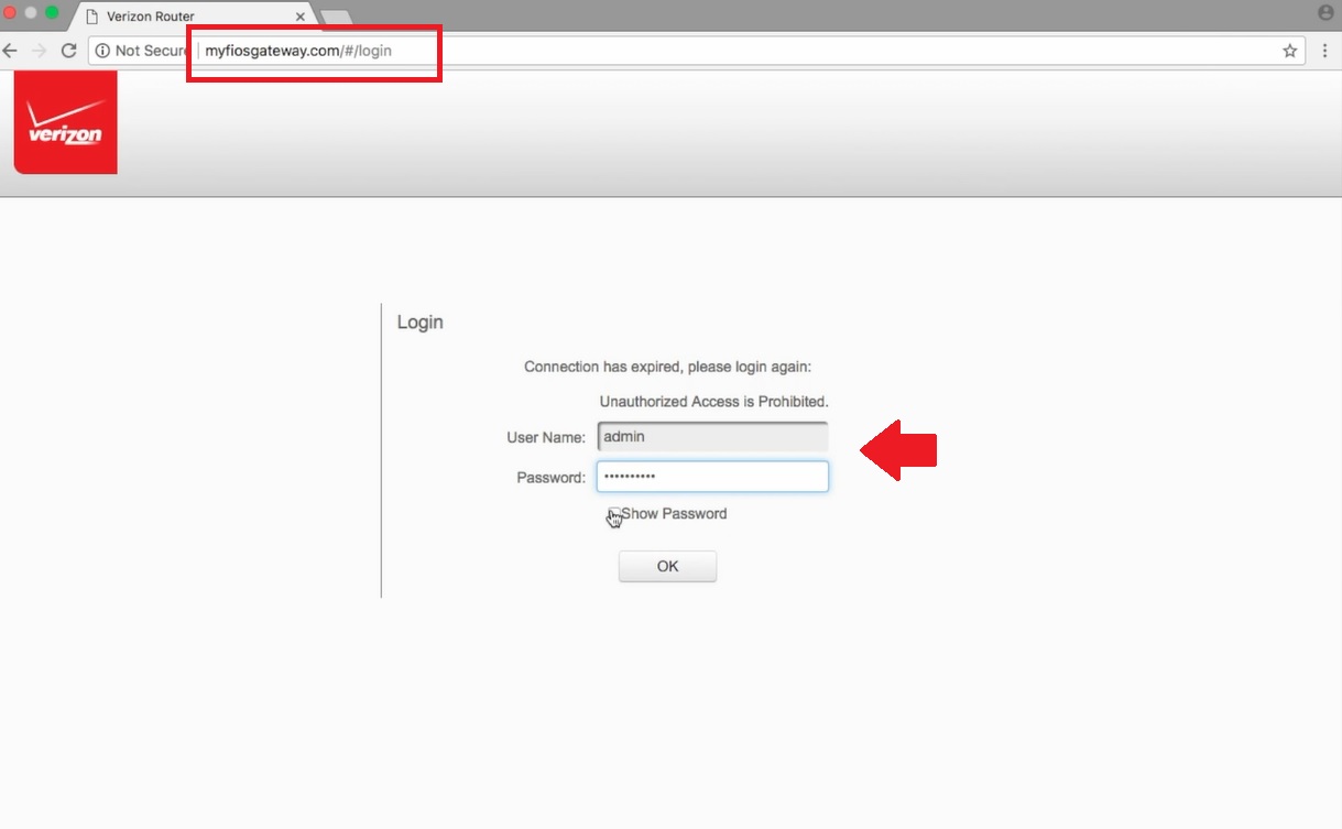 - Use default username “admin” and Default password as printed to your FIOS gateway sticker to the login control panel.