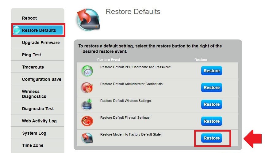 Restore modem to factory default state- Restore (use this option to restore the configuration to full factory reset.