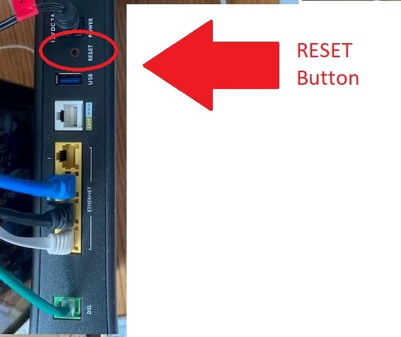 - Locate a small reset button or reset keyhole nearby the Ethernet button or power button.