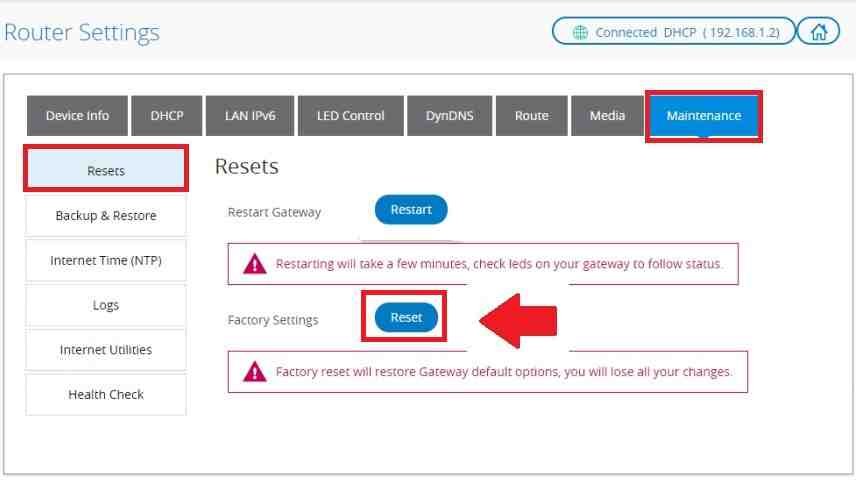 - Go to the Maintenance tab from the top menu. Click on the Reset option from the submenu under the main menu.