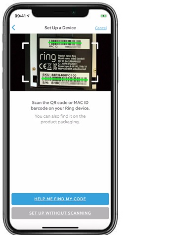 - Point the camera to the bar code or QR code available on the Ring device and wait to read.