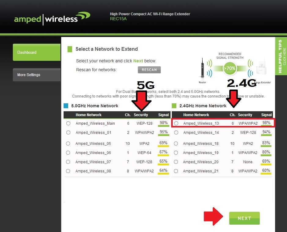 • After a successful connection with the Repeater device, you will get a new SSID name something like “Amped_REC15A_2.4_EXT and Amped_REC15A_5G_EXT.
