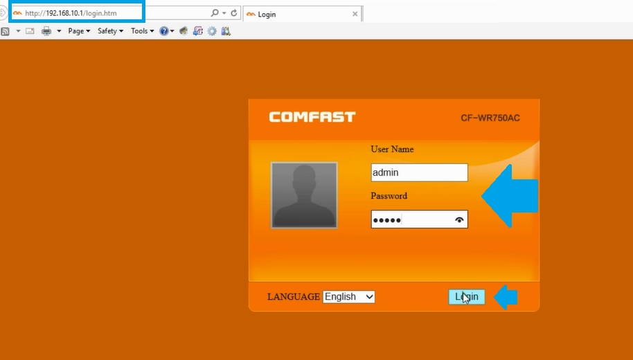 - Open a web browser and access http://192.168.10.1 to the URL bar and wait to load login page.