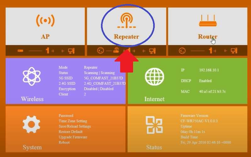 Click Repeater option to change repeater mode to connect reapter device with host networks.