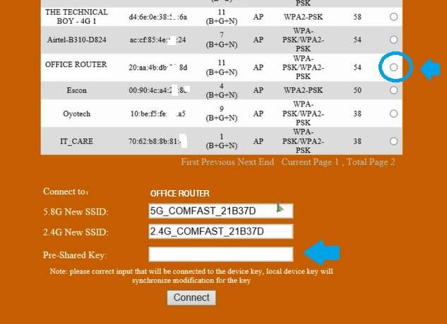 Pre-Shared key- Provide old exiting host wifi network password to allow connection from Comfast repeater.