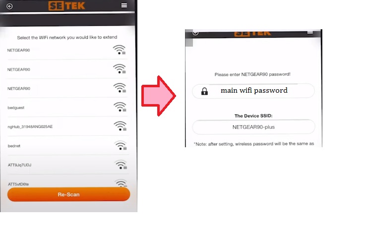 Exp– Existing WiFi name is – Wireless then Setek Booster signal SSID will Wireless-Plus with the same password as your existing wifi key.