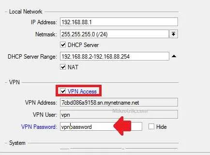 To configure VPN in Mikrotik device enable VPN first and setup VPN password.