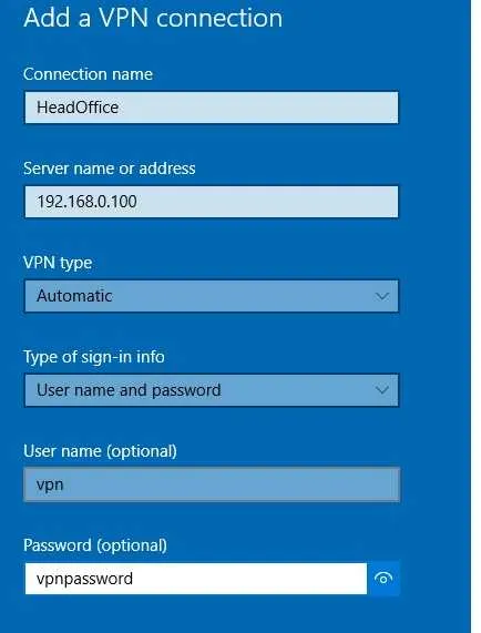 Server Name or address: give the WAN IP address of Mikrotik router you have setup VPN.