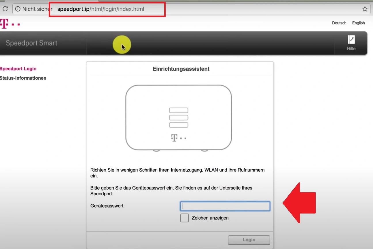 - Open the web browser and access the default Login URL http://speedport.ip or use the default IP address 192.168.2.1.