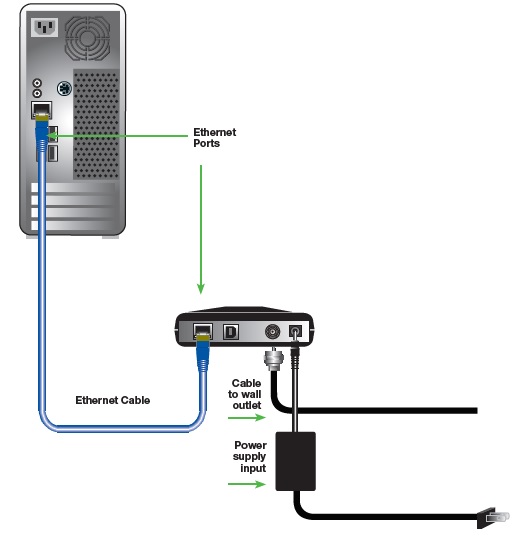 - Internet cable coming from the Internet provider side should connect to Coaxial port in the modem.
