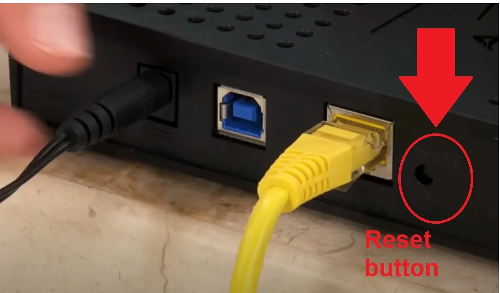 - Locate a small reset button hole beside the Ethernet port.