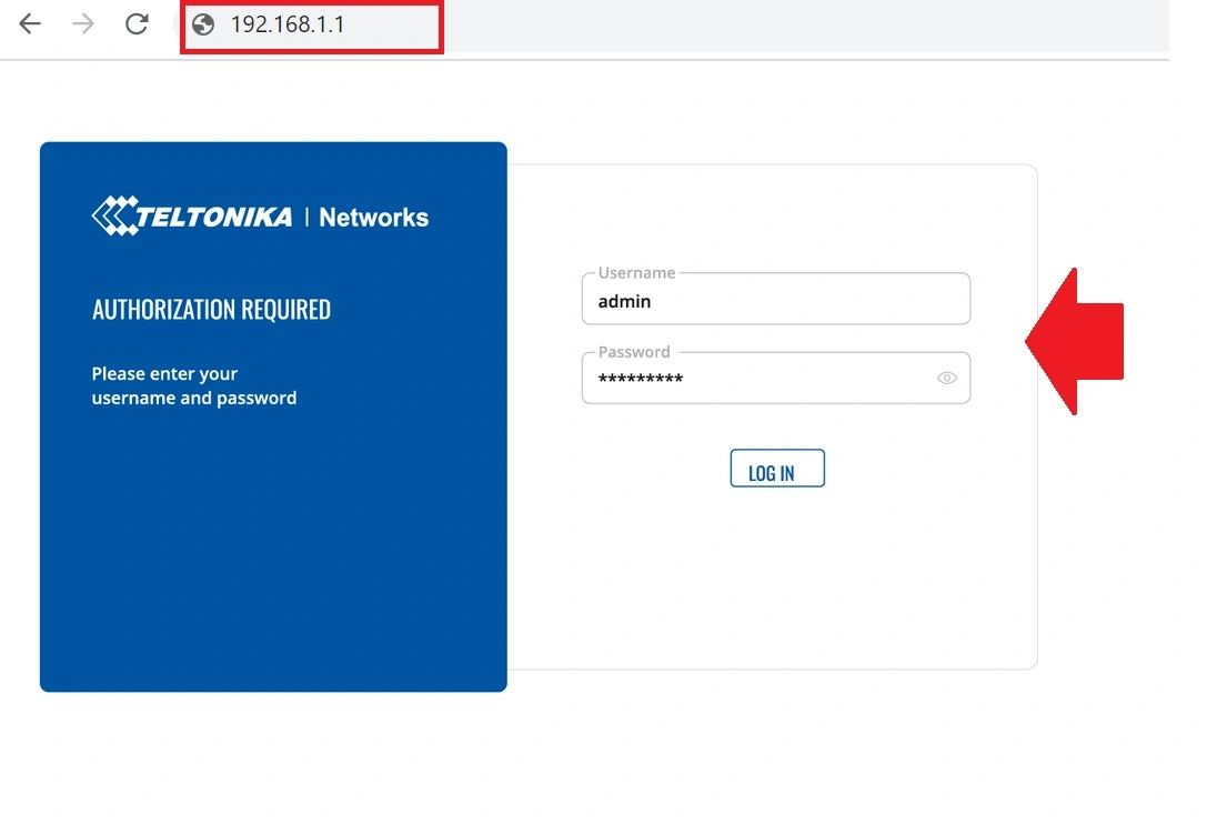 - Open the web browser for web login and access http://192.168.1.1 and you will be redirected to the Teltonika router login page.