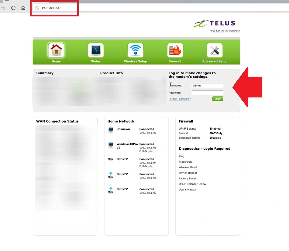 Login Telus router Web interface from browser