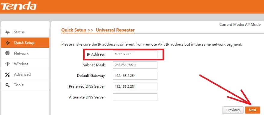 Always change the default IP address to secure your network. Change Tenda O3 universal repeater IP address to the same series IP address of the Access Point device so you can access without changing IP Address.