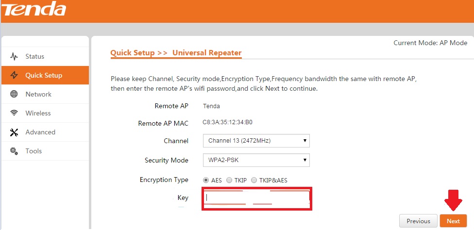 Key– ap-password (type password of the Access point you want to connect Tenda repeater)