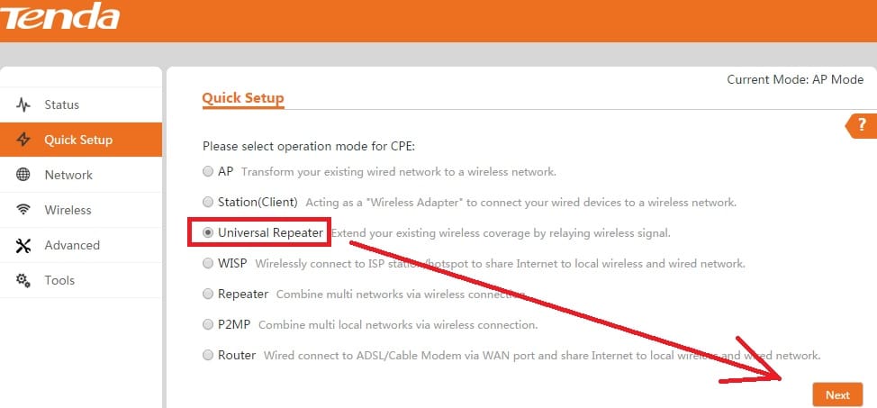 Universal Repeater mode work to connect a non-Tenda brand AP device from the Tenda device.