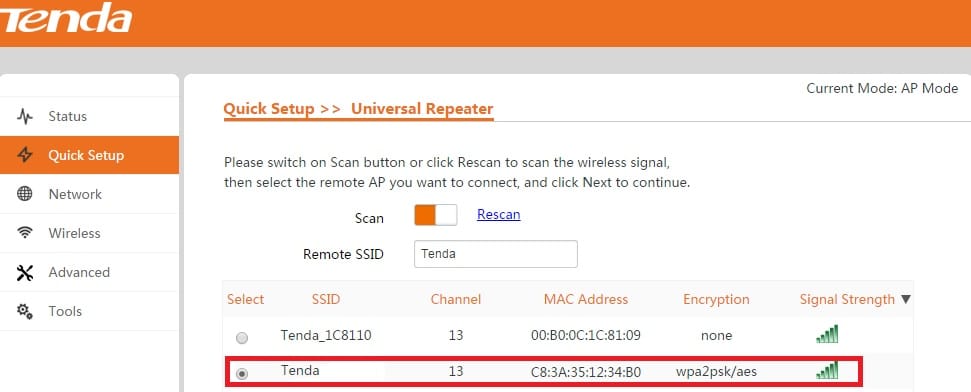 Universal Repeater mode work to connect a non-Tenda brand AP device from the Tenda device.