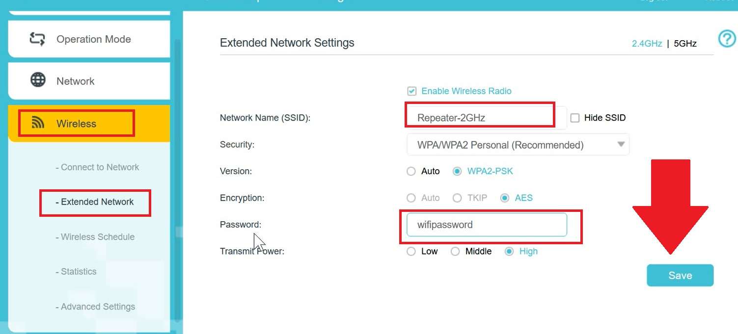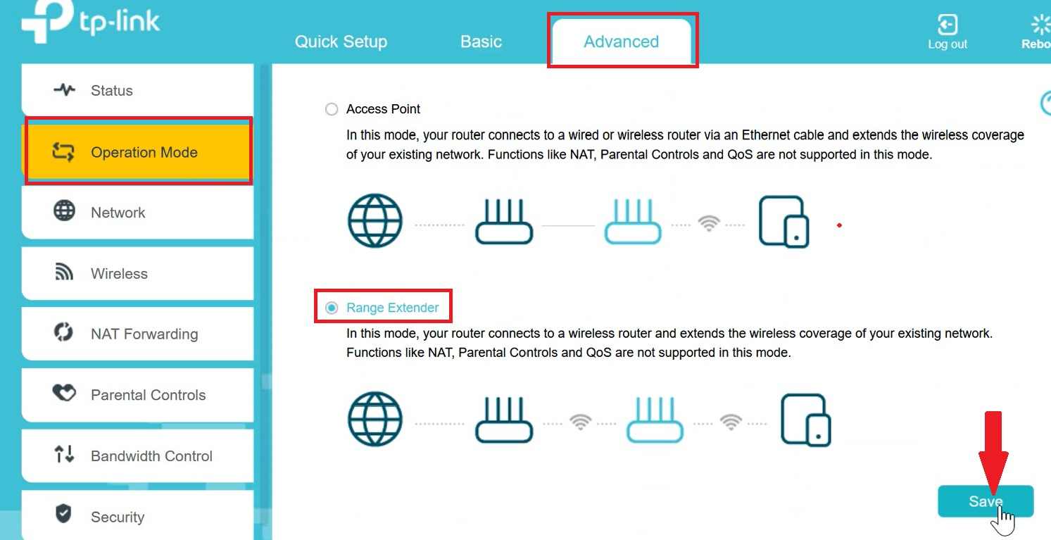 - Scroll the page down and select Range Extender mode and save settings to apply changes.