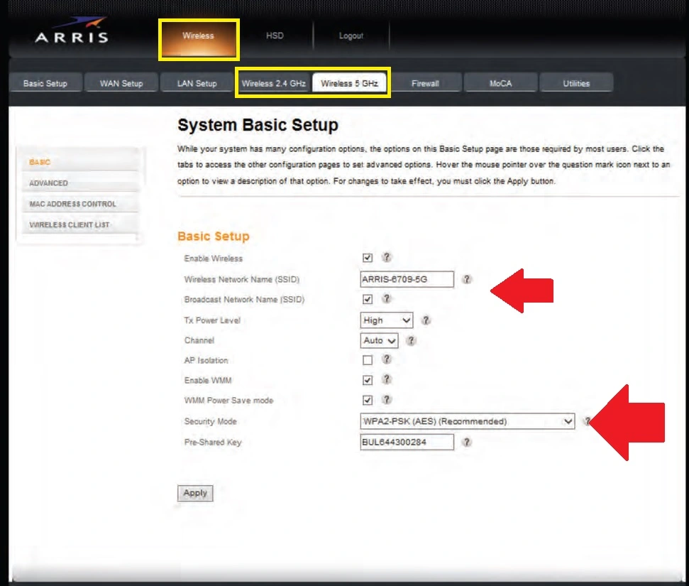 Wireless Network name (SSID)– ARRIS (change default SSID and create new wifi name as per your choice)