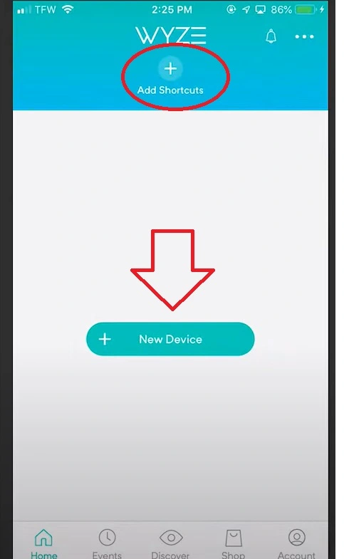 - Open the Wyze app and from Home press, the Plus sign (+) from the top left corner to add a new device.
