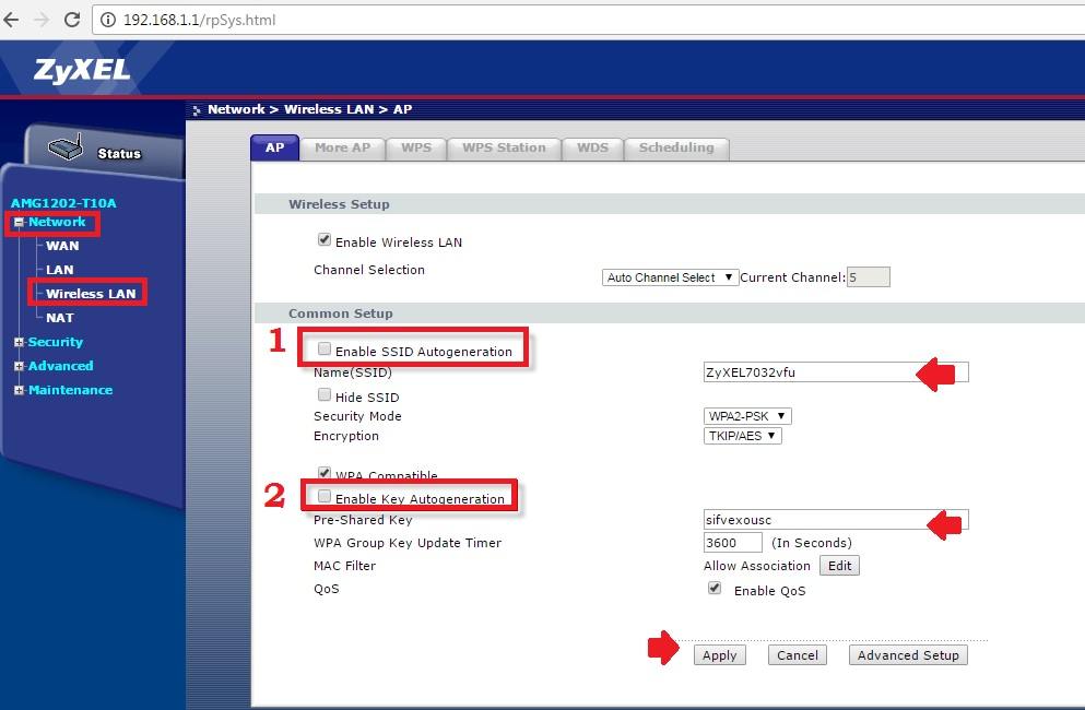 In default mode ZyxaL router Auto SSID generation so you must disable it and create your own wireless network name.